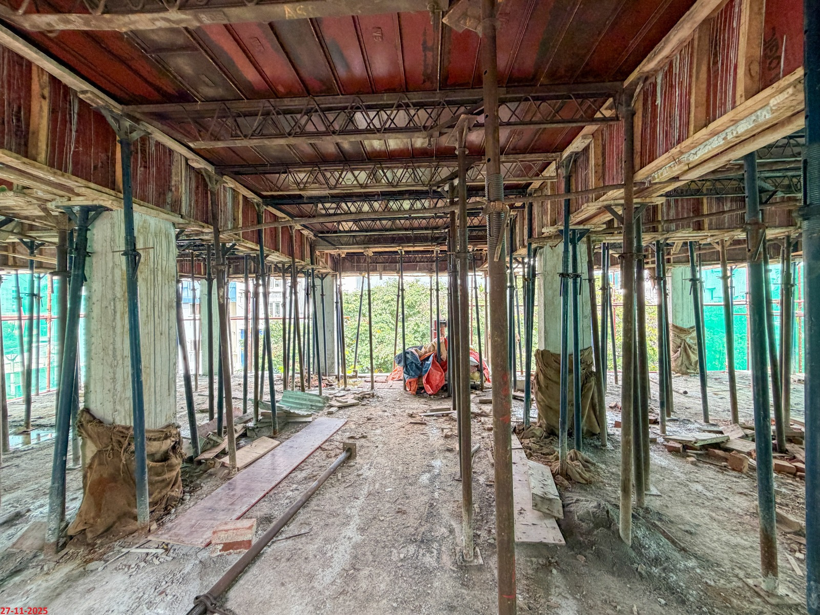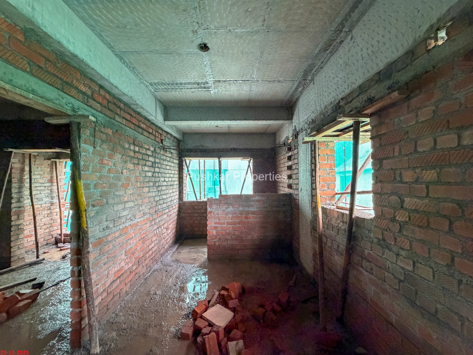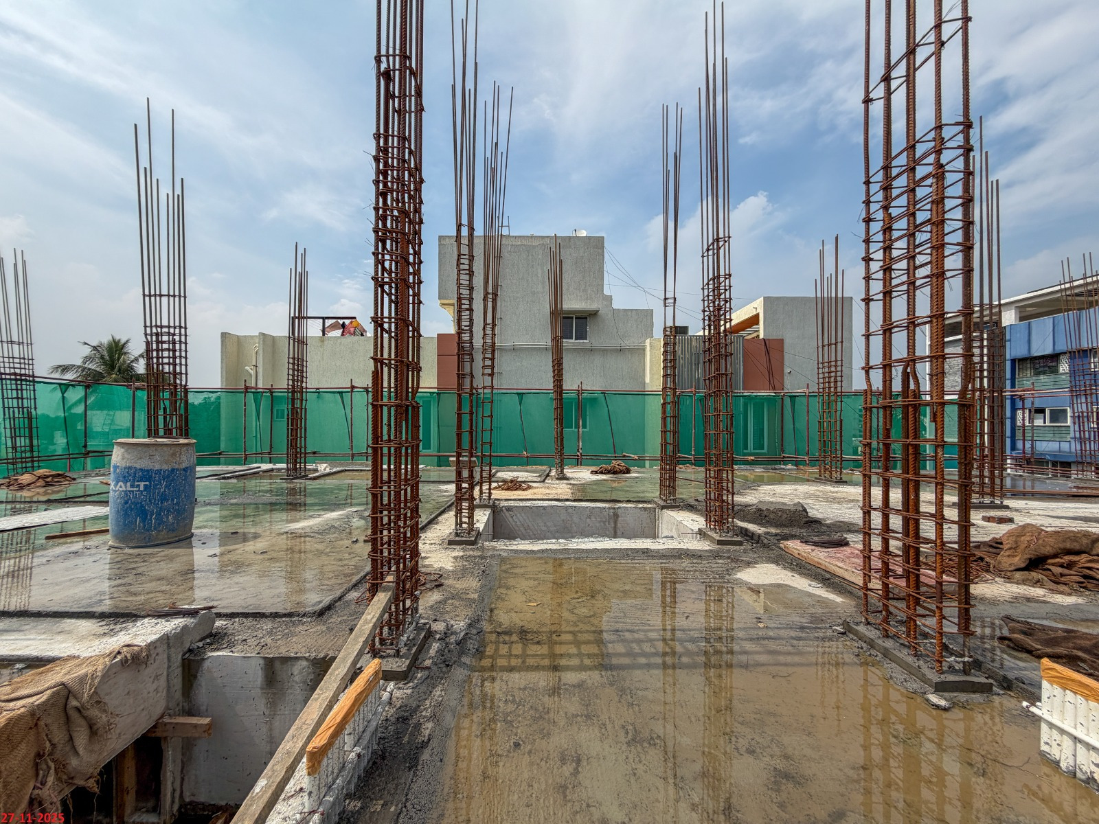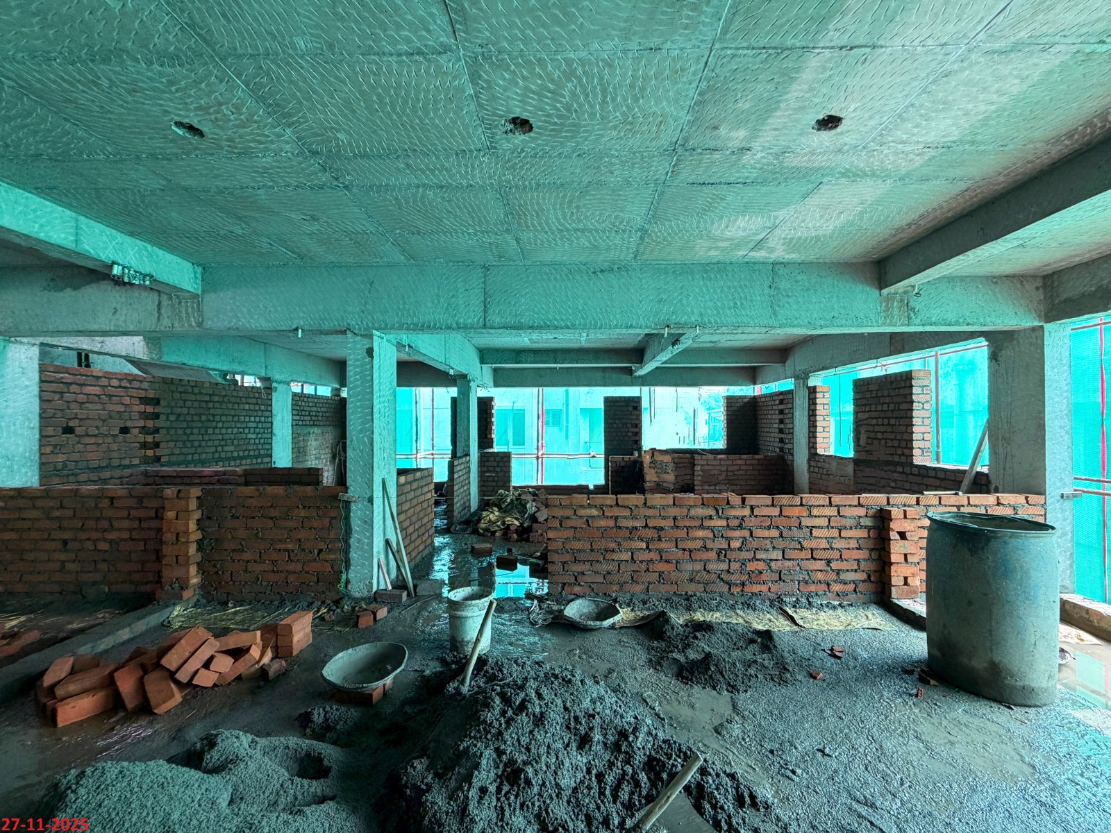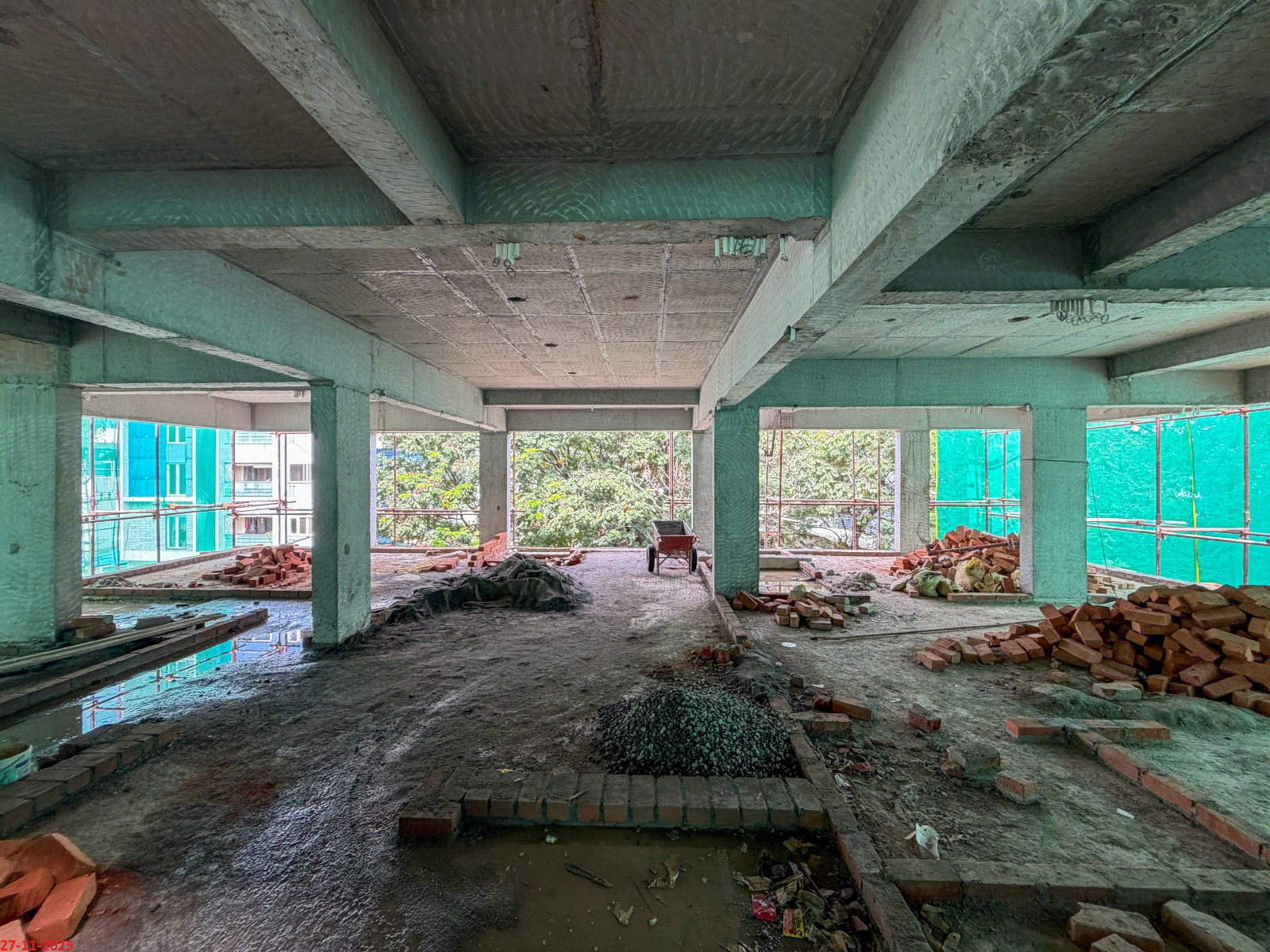 - Basement filling with filling soil, topped and consolidated with 6” inches of M. Sand and 6” inches of P.C.C with a mix ratio of 1:4:8.