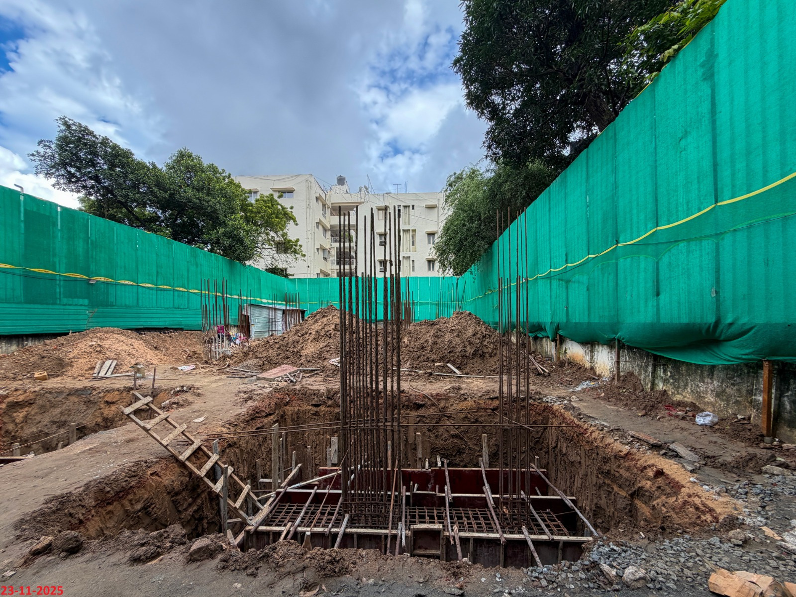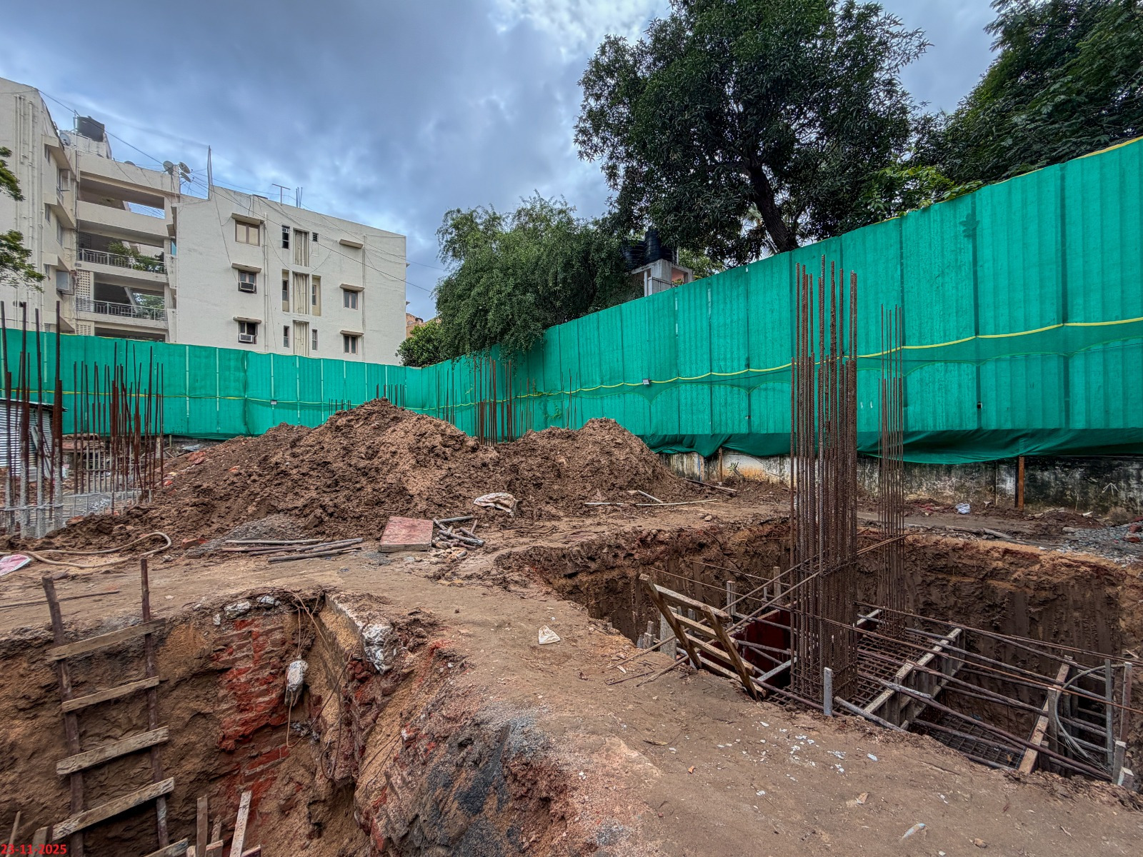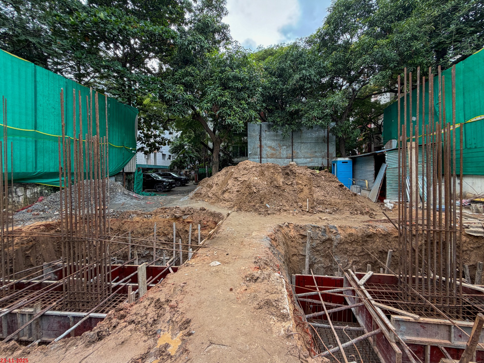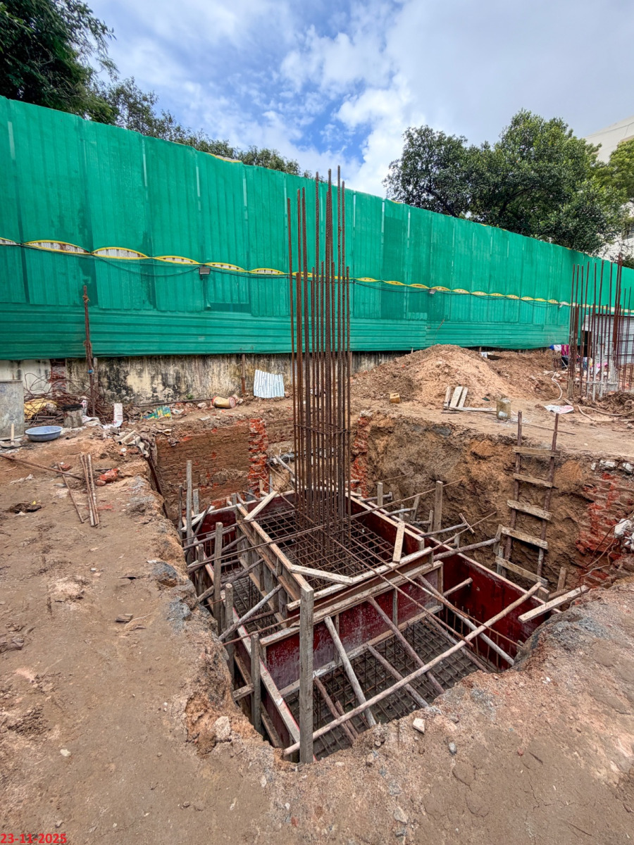 - Basement filling with filling soil, topped and consolidated with 6” inches of M. Sand and 6” inches of P.C.C with a mix ratio of 1:4:8.
