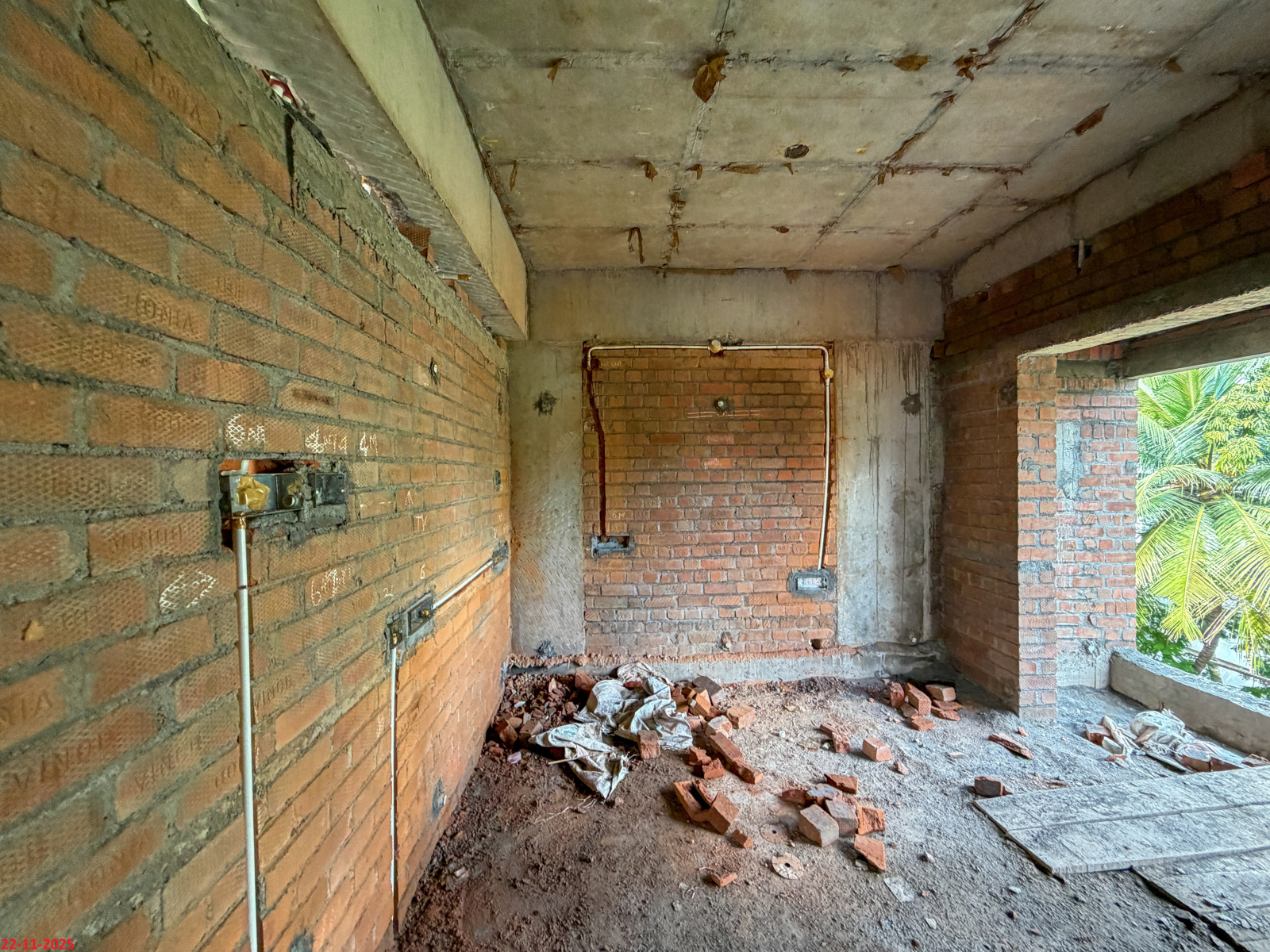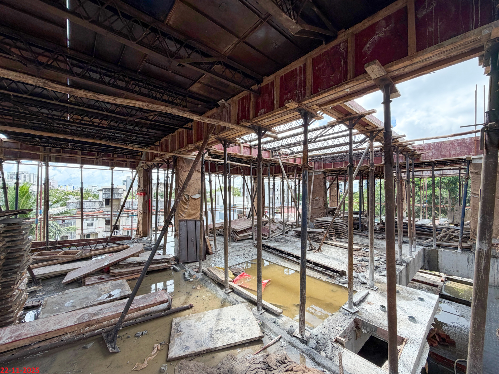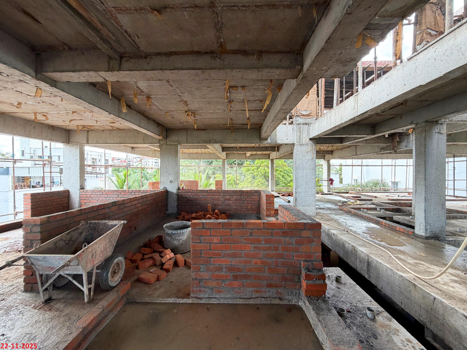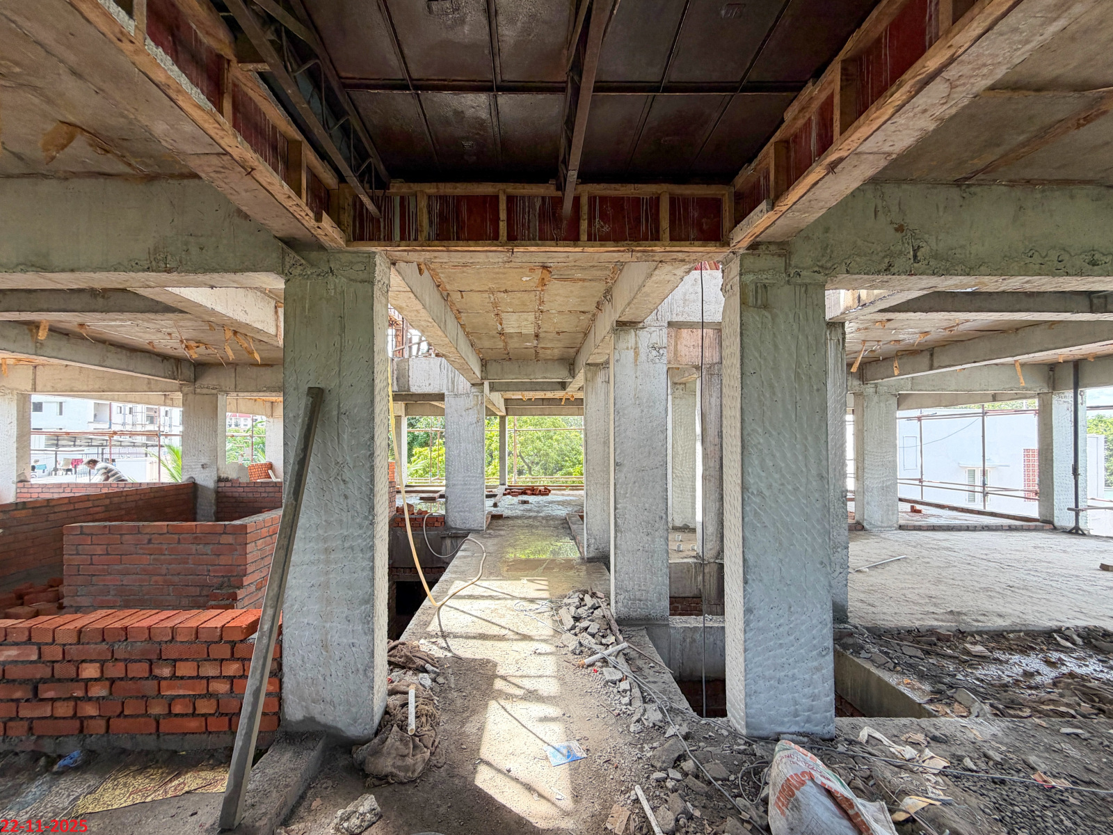 - Basement filling with filling soil, topped and consolidated with 6” inches of M. Sand and 6” inches of P.C.C with a mix ratio of 1:4:8.